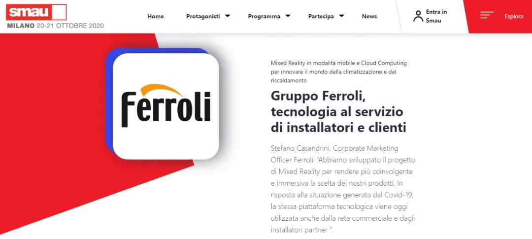 2020年10月22日,國際信息與通信技術展覽會(SMAU 2020)在意大利召開,在暖通行業享譽國際60多年的Ferroli法羅力再次獲得了國際大獎--創新獎。表彰企業通過促進和分享已經在自身研究領域中成功實施創新項目的直接經驗,為整個國家乃至全世界的生產系統所必需的變革進程提供有效支持。
